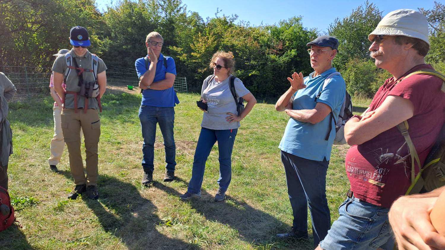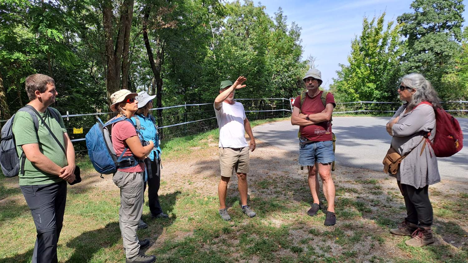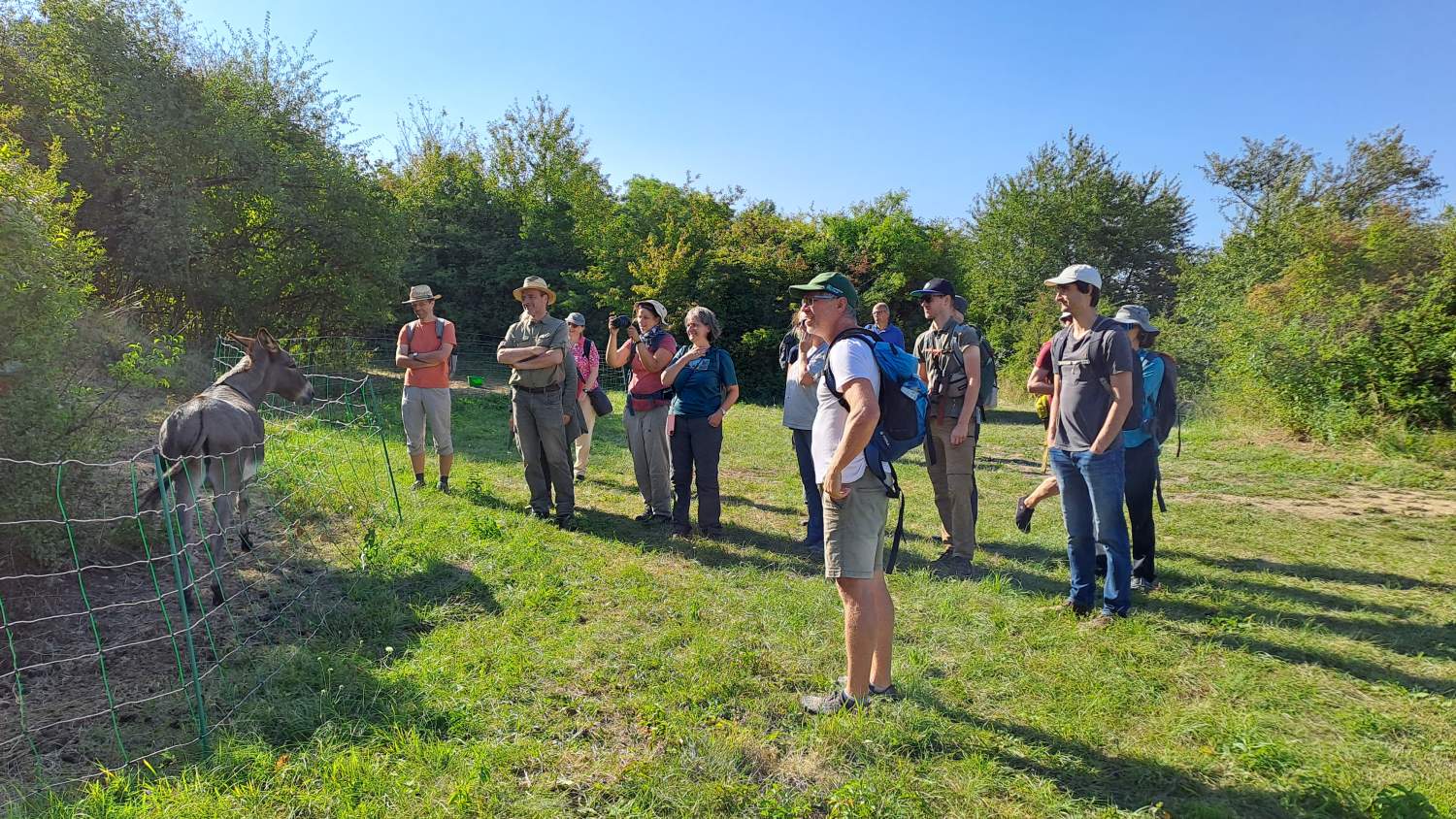 Anlässlich des Starts des Projekts "Wilde Weiden" im Naturpark Leiser Berge (Projekt Wilde Weiden) fand dieser Fachaustausch zur Naturschutzbeweidung an zwei attraktiven Standorten statt. Erster Exkursionspunkt war der Waschberg bei Leitzersdorf, wo die wertvollen Halbtrockenrasen im Auftrag der Gemeinde seit 2019 vom Landschaftspflegeteam Holzer entbuscht und gemäht werden. Zwischen Mai und August 2025 wurden einige kleine Teilflächen (im Gesamtausmaß von 1,6 Hektar, davon ein Teil in Vorjahren bereits gepflegt und ein Teil noch ungepflegt) erstmals beweidet. Bürgermeisterin Sabine Hopf und Projektbetreuerin Julia Kelemen-Finan gaben einen Überblick der Aktivitäten, und dann holte der Leiter der Tierhaltung Alexander Ernst die Esel und Schafböcke vor den Vorhang. Oder besser: an den Weidezaun. Da die meisten Teilnehmer*innen selbst in Beweidungsprojekte und/oder Monitoring involviert sind – und sich die Weidetiere bereitwillig aufs Maul schauen ließen - folgten anregende Diskussionen über Mahd- und Weideeffekte, Fressverhalten, Dauer, Zeitraum, Intensität, Weidepflege und andere Aspekte, die eine naturschutzfachlich erfolgreiche Pflege ausmachen. Aufwand und Kosten waren ebenfalls ein wichtiges Thema. Fazit zum Waschberg: der Pilotversuch im heurigen Jahr ist nach Einschätzung der Teilnehmer*innen aus naturschutzfachlicher Sicht sehr positiv, auch wenn nicht alle Ziele erreicht wurden. So wurden von einigen Anwesenden etwa das Ausmaß an geschaffenem Offenboden oder die Strukturen an den Übergängen vom Gebüsch zur Wiese als sehr passend bewertet. Anderseits eignen sich die eingesetzten Weidetiere (3 Esel und 4 Schafböcke) zur „Entbuschung“ von dichten, bisher nicht entbuschten Flächen nicht. Auch auf einem Teil der (vor der Beweidung bereits entbuschten und) heuer ab Juli beweideten Flächen muss noch eine Weidepflege zum Nachschnitt von Rotem Hartriegel und Wolligem Schneeball erfolgen, damit die Gehölze nicht wieder nachwachsen. Eine differenzierte Bewertung aus naturschutzfachlicher und ökonomischer Sicht steht noch aus.