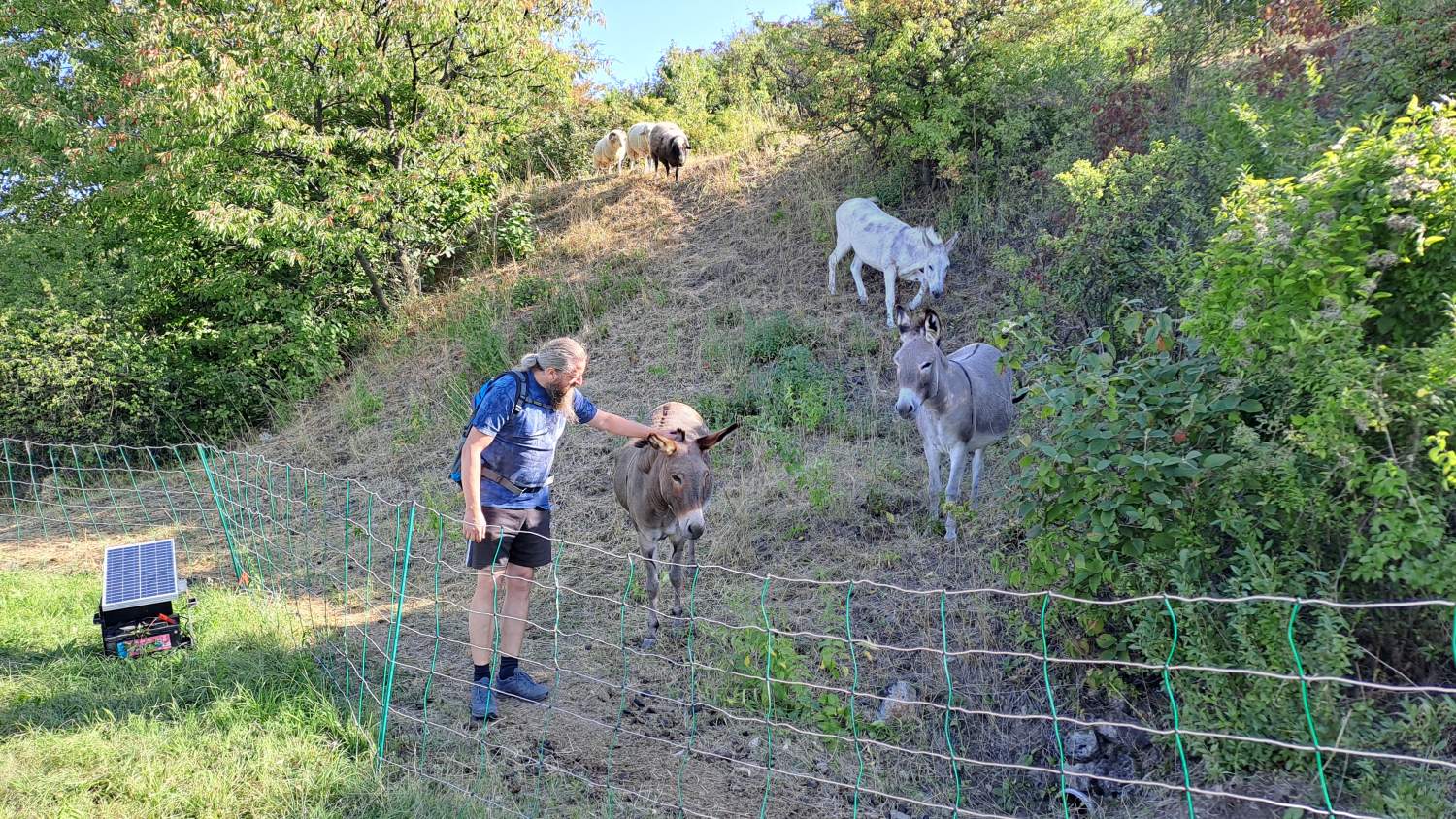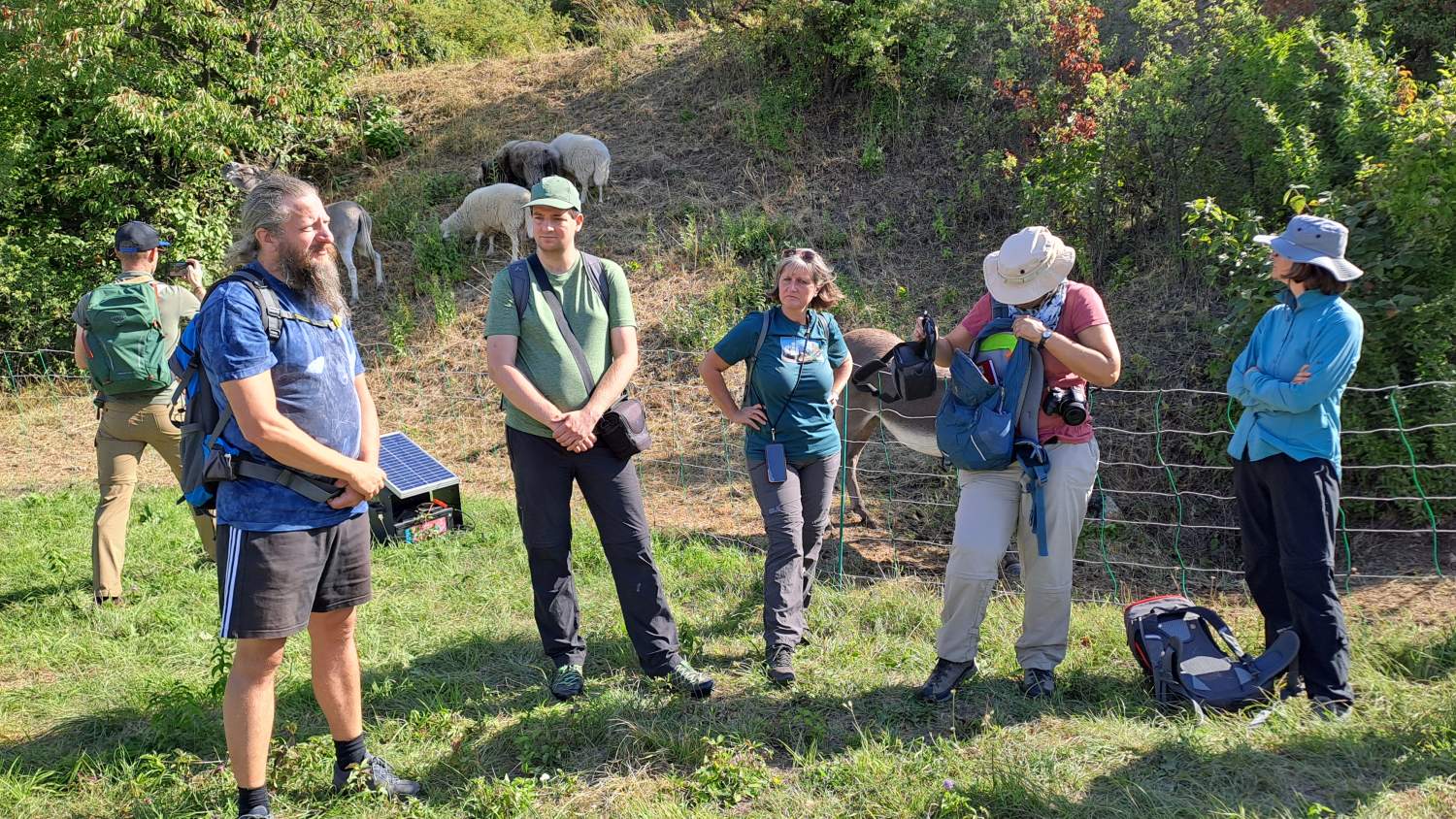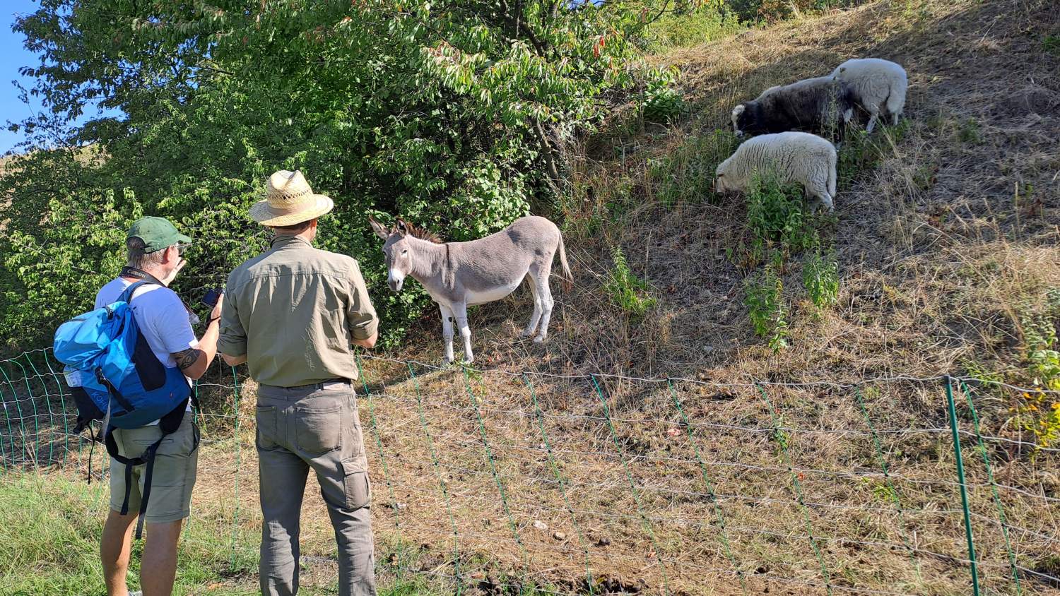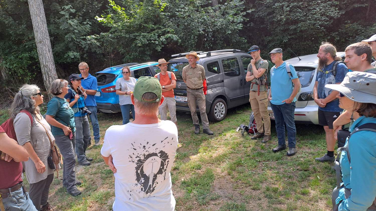 Anlässlich des Starts des Projekts "Wilde Weiden" im Naturpark Leiser Berge (Projekt Wilde Weiden) fand dieser Fachaustausch zur Naturschutzbeweidung an zwei attraktiven Standorten statt. Erster Exkursionspunkt war der Waschberg bei Leitzersdorf, wo die wertvollen Halbtrockenrasen im Auftrag der Gemeinde seit 2019 vom Landschaftspflegeteam Holzer entbuscht und gemäht werden. Zwischen Mai und August 2025 wurden einige kleine Teilflächen (im Gesamtausmaß von 1,6 Hektar, davon ein Teil in Vorjahren bereits gepflegt und ein Teil noch ungepflegt) erstmals beweidet. Bürgermeisterin Sabine Hopf und Projektbetreuerin Julia Kelemen-Finan gaben einen Überblick der Aktivitäten, und dann holte der Leiter der Tierhaltung Alexander Ernst die Esel und Schafböcke vor den Vorhang. Oder besser: an den Weidezaun. Da die meisten Teilnehmer*innen selbst in Beweidungsprojekte und/oder Monitoring involviert sind – und sich die Weidetiere bereitwillig aufs Maul schauen ließen - folgten anregende Diskussionen über Mahd- und Weideeffekte, Fressverhalten, Dauer, Zeitraum, Intensität, Weidepflege und andere Aspekte, die eine naturschutzfachlich erfolgreiche Pflege ausmachen. Aufwand und Kosten waren ebenfalls ein wichtiges Thema. Fazit zum Waschberg: der Pilotversuch im heurigen Jahr ist nach Einschätzung der Teilnehmer*innen aus naturschutzfachlicher Sicht sehr positiv, auch wenn nicht alle Ziele erreicht wurden. So wurden von einigen Anwesenden etwa das Ausmaß an geschaffenem Offenboden oder die Strukturen an den Übergängen vom Gebüsch zur Wiese als sehr passend bewertet. Anderseits eignen sich die eingesetzten Weidetiere (3 Esel und 4 Schafböcke) zur „Entbuschung“ von dichten, bisher nicht entbuschten Flächen nicht. Auch auf einem Teil der (vor der Beweidung bereits entbuschten und) heuer ab Juli beweideten Flächen muss noch eine Weidepflege zum Nachschnitt von Rotem Hartriegel und Wolligem Schneeball erfolgen, damit die Gehölze nicht wieder nachwachsen. Eine differenzierte Bewertung aus naturschutzfachlicher und ökonomischer Sicht steht noch aus.