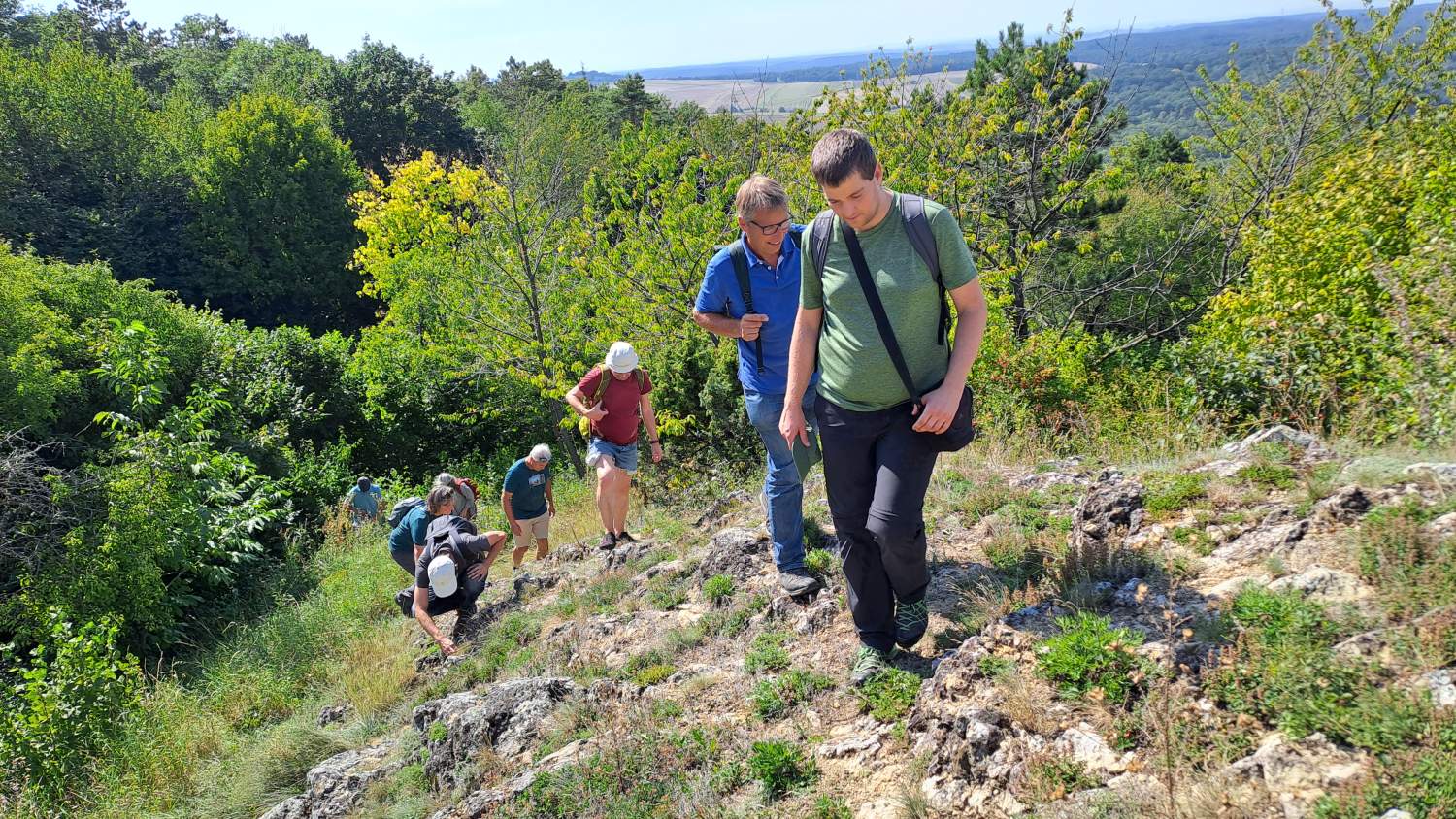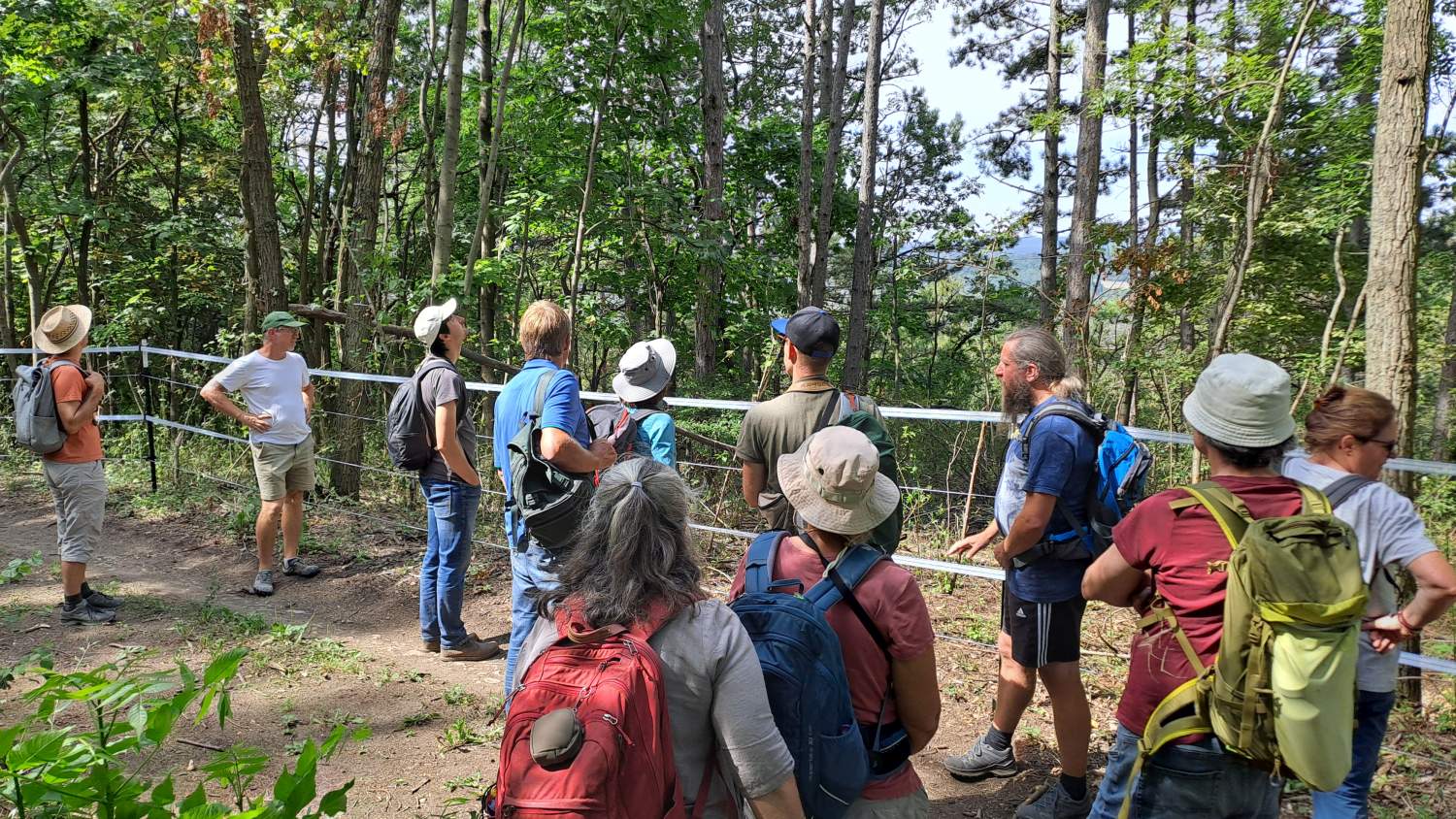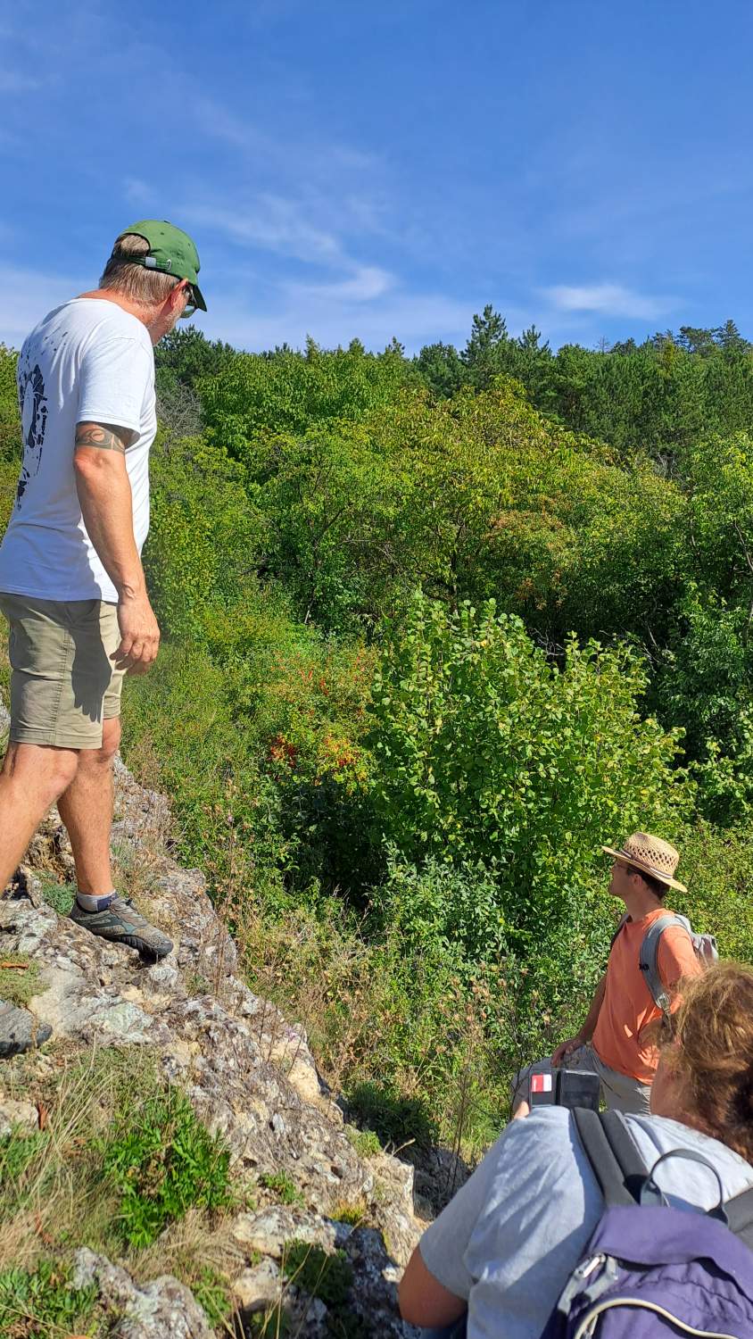 Szenenwechsel zum Buschberg in den Leiser Bergen. Hier präsentierten Alexander Ernst und Manuel Denner die gänzlich anderen Rahmenbedingungen, der Fokus ist auf Waldweide mit großen Pflanzenfressern. Mit 4 Konik-Pferden und 8 Zillertaler Rindern werden insgesamt 17 Hektar Wald und Offenflächen in mehreren großen Koppeln nacheinander beweidet. Dazu ist auch eine andere Infrastruktur inklusive Traktor notwendig. Wichtige Diskussionspunkte waren unter anderem die rechtlichen Aspekte der Beweidung im Wald sowie die Finanzierung des Projektes. Zum Abschluss bestiegen wir noch den Felsrücken, der schon im Rahmen eines Freiwilligeneinsatzes bei den „Gemeindebausteinen NÖ“ im Jahr 2019 entbuscht wurde, und wo Waldschafe seither jährlich im Herbst überstandiges Material „wegputzen“. Die Große Küchenschelle (Pulsatilla grandis), die heuer im Spätsommer nochmals kräftig nachwuchs, übersät den freigestellten Aussichtspunkt eindrucksvoll.