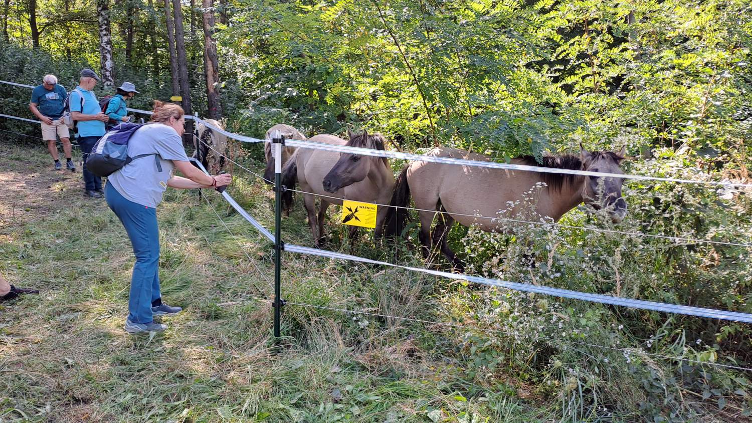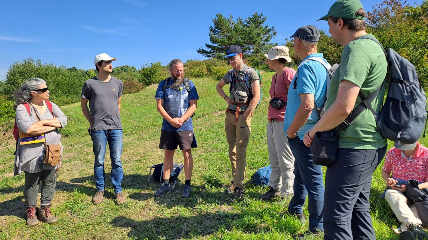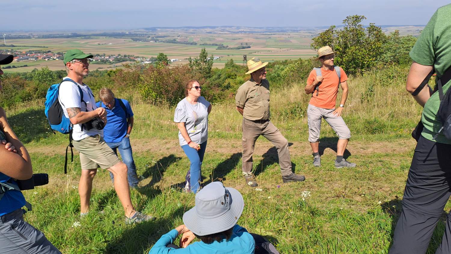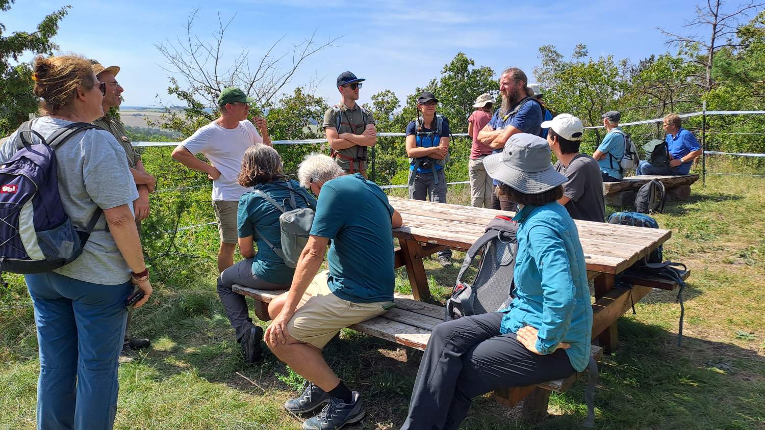 Szenenwechsel zum Buschberg in den Leiser Bergen. Hier präsentierten Alexander Ernst und Manuel Denner die gänzlich anderen Rahmenbedingungen, der Fokus ist auf Waldweide mit großen Pflanzenfressern. Mit 4 Konik-Pferden und 8 Zillertaler Rindern werden insgesamt 17 Hektar Wald und Offenflächen in mehreren großen Koppeln nacheinander beweidet. Dazu ist auch eine andere Infrastruktur inklusive Traktor notwendig. Wichtige Diskussionspunkte waren unter anderem die rechtlichen Aspekte der Beweidung im Wald sowie die Finanzierung des Projektes. Zum Abschluss bestiegen wir noch den Felsrücken, der schon im Rahmen eines Freiwilligeneinsatzes bei den „Gemeindebausteinen NÖ“ im Jahr 2019 entbuscht wurde, und wo Waldschafe seither jährlich im Herbst überstandiges Material „wegputzen“. Die Große Küchenschelle (Pulsatilla grandis), die heuer im Spätsommer nochmals kräftig nachwuchs, übersät den freigestellten Aussichtspunkt eindrucksvoll.