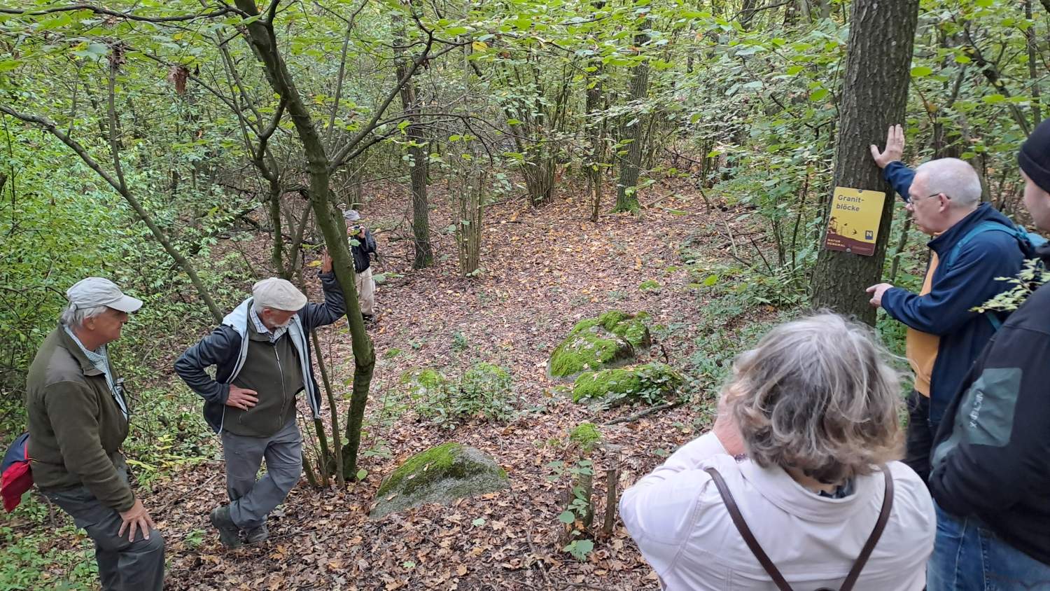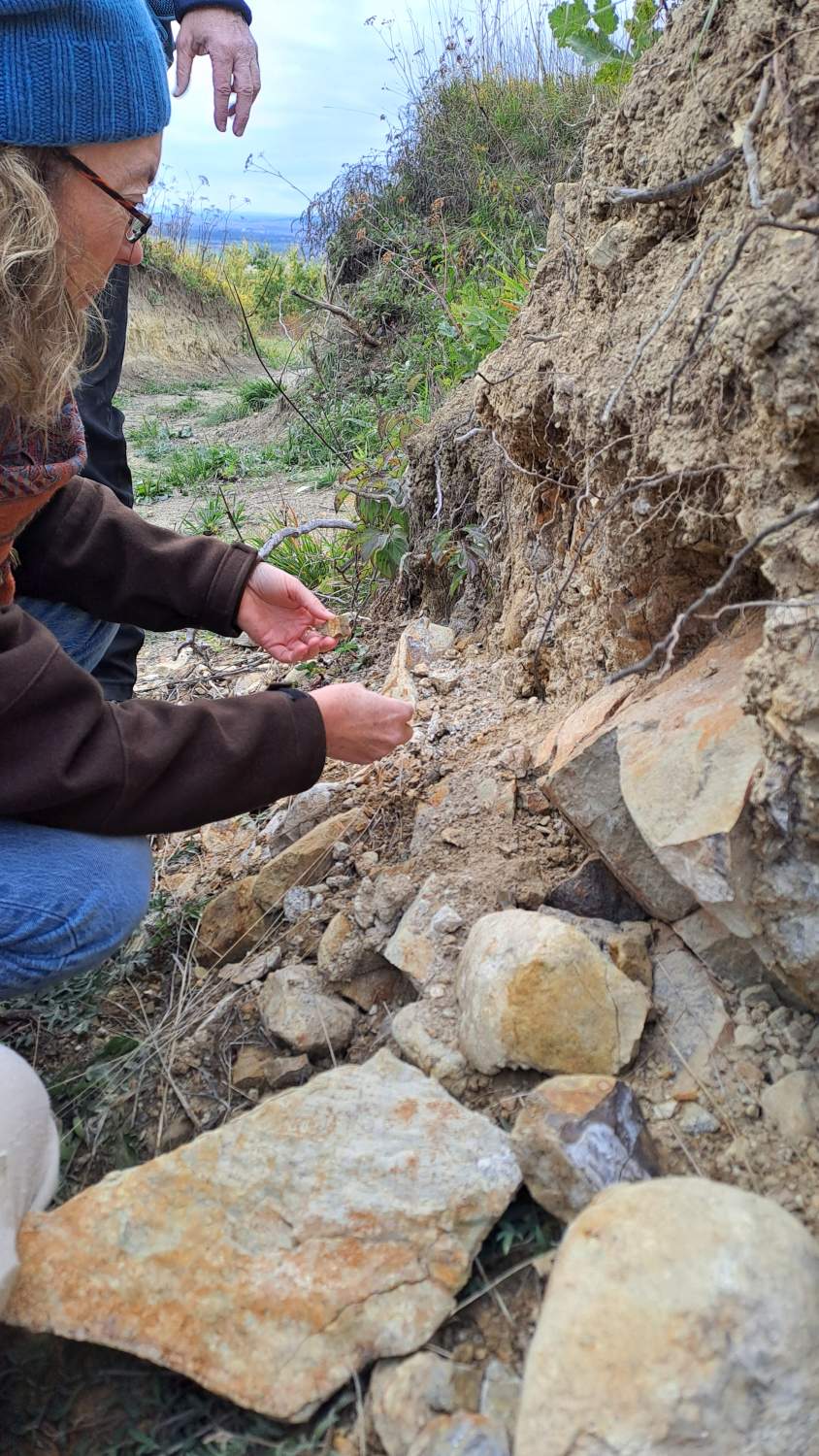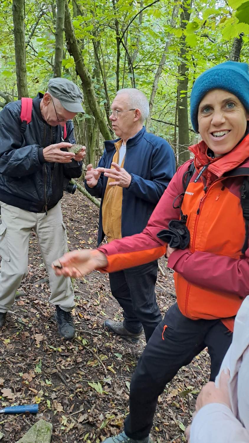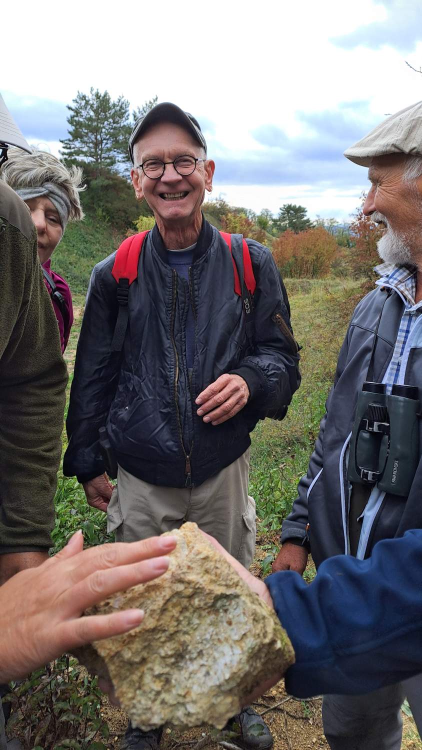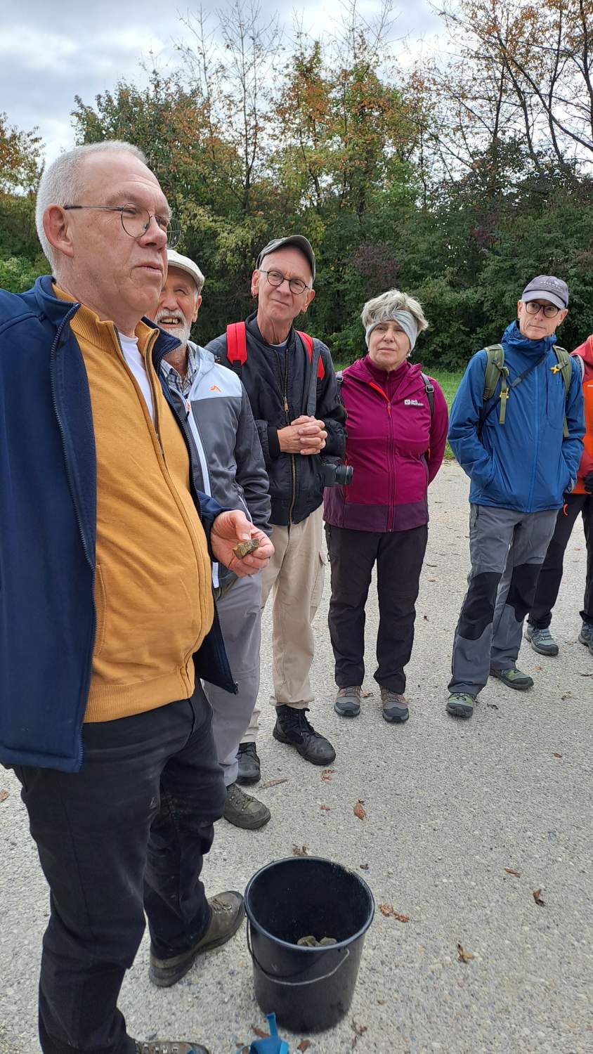 Die letzte Exkursion des heurigen Jahres war unsere erste geologische Exkursion! Während die Teilnehmer*innen aus nah und fern mit Tieren und Pflanzen am Waschberg schon gut vertraut sind, gibt die Geologie doch so manche Rätsel auf. Aber dank der Restaurationsmaßnahmen im aktuellen Biodiversitäts-Projekt ist der heimliche Untergrund sichtbarer geworden, und gerade die freigelegten Abbrüche und Steilwände laden zum Suchen und Staunen ein. Aber zunächst präsentiert uns Dr. Holger Gebhardt von Geosphere Austria, und Mitautor des Waschberg-Buches, einen Ausblick in die Landschaft vom Gipfel des Michelberges – und damit eine anschauliche Einführung in die Jahrmillionen der Vergangenheit, bevor und während die Klippenzone aus dem ursprünglichen Meer entstanden ist. Sehr geduldig und mit Hilfe schöner Illustrationen – und Funde! - geht er auf viele neugierige Fragen nach Entstehung und Aufbau der Gesteine und Fossilien ein.