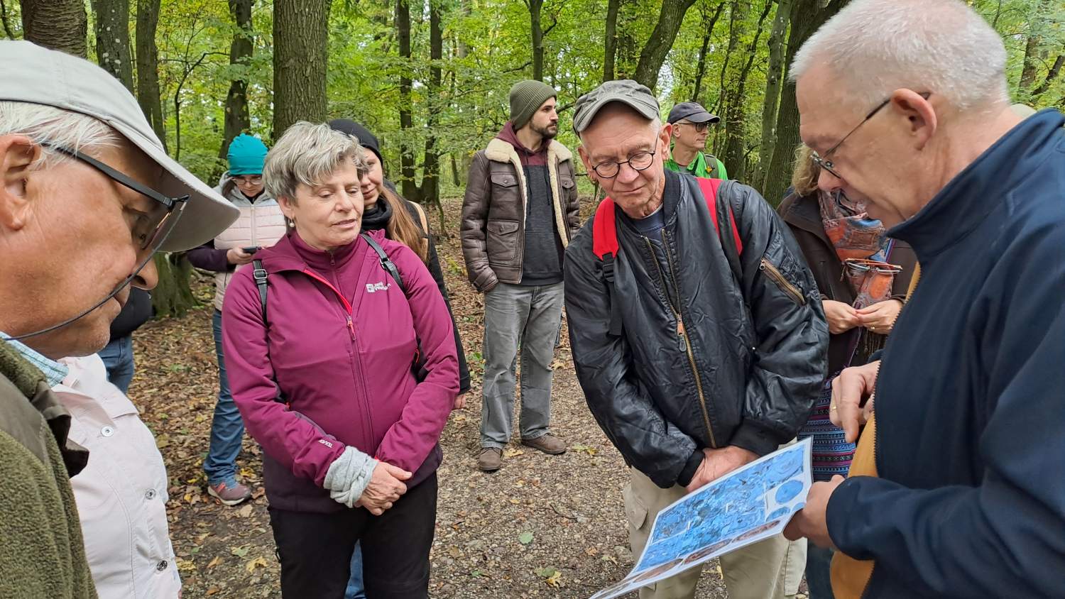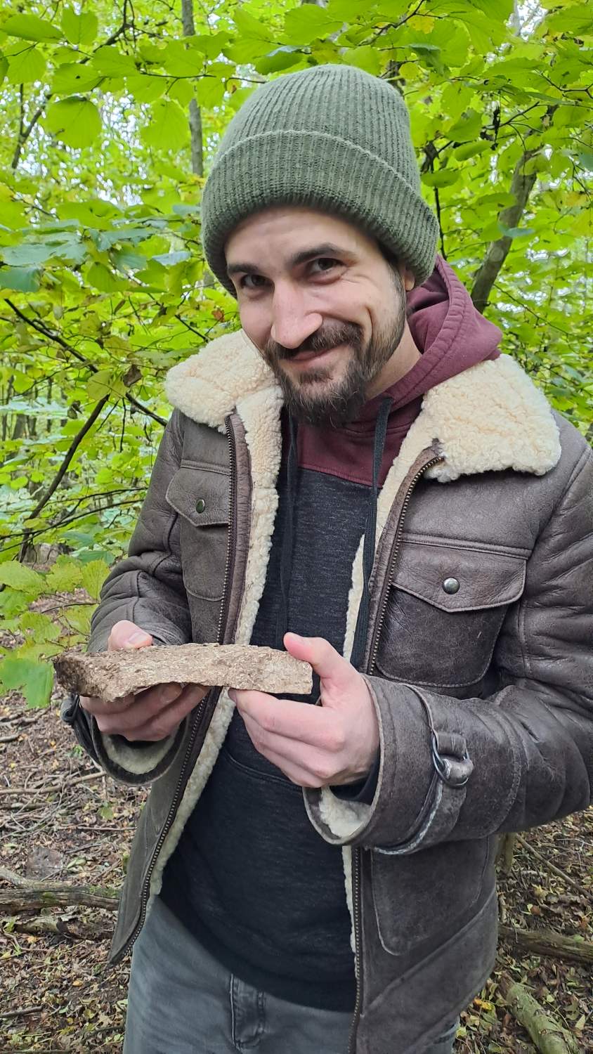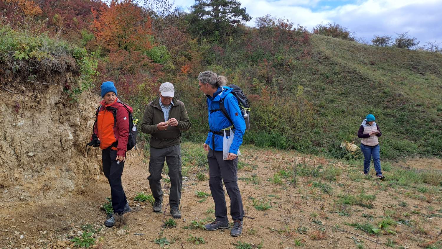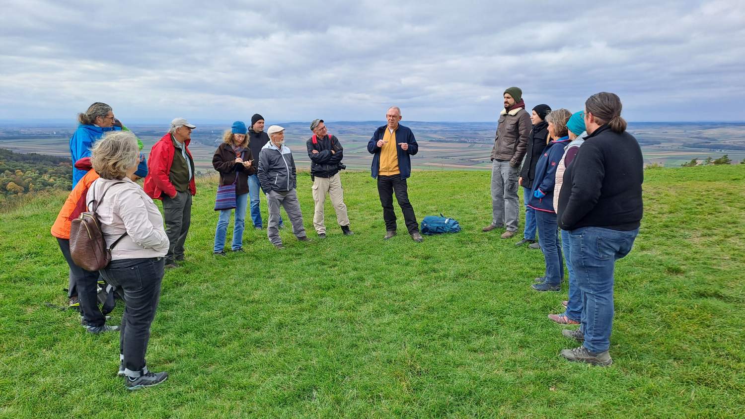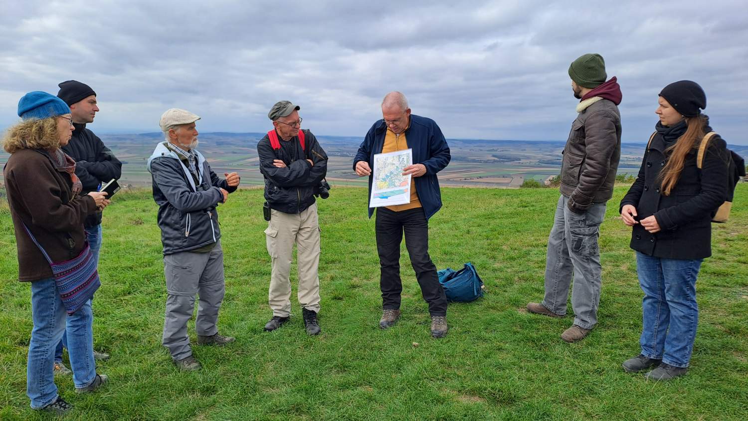 Die letzte Exkursion des heurigen Jahres war unsere erste geologische Exkursion! Während die Teilnehmer*innen aus nah und fern mit Tieren und Pflanzen am Waschberg schon gut vertraut sind, gibt die Geologie doch so manche Rätsel auf. Aber dank der Restaurationsmaßnahmen im aktuellen Biodiversitäts-Projekt ist der heimliche Untergrund sichtbarer geworden, und gerade die freigelegten Abbrüche und Steilwände laden zum Suchen und Staunen ein. Aber zunächst präsentiert uns Dr. Holger Gebhardt von Geosphere Austria, und Mitautor des Waschberg-Buches, einen Ausblick in die Landschaft vom Gipfel des Michelberges – und damit eine anschauliche Einführung in die Jahrmillionen der Vergangenheit, bevor und während die Klippenzone aus dem ursprünglichen Meer entstanden ist. Sehr geduldig und mit Hilfe schöner Illustrationen – und Funde! - geht er auf viele neugierige Fragen nach Entstehung und Aufbau der Gesteine und Fossilien ein.
