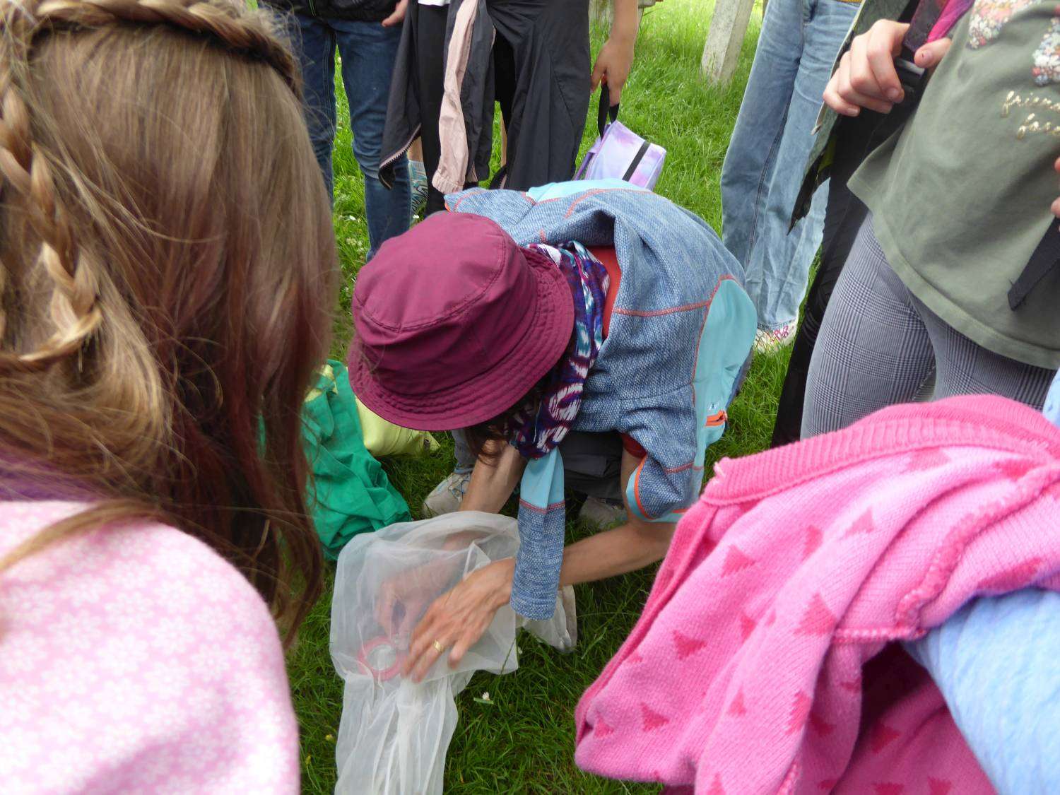 Die ersten Kinder beginnen auch gleich, die bunte Blumenwelt der Raine zu erkunden. Da war doch schon ein wenig Steppen-Salbei am Weg, aber nur einige Kinder haben ihn gesehen. Deshalb herrscht in der Blumengruppe zunächst ein bisschen Verwirrung… Den Geruch kennen doch alle: vom Salbeitee natürlich!! Dann folgt das ganze Farbenspektrum: die gelbe Königskerze, das blaue Ochsenauge, der weiße "Windling"… Bei letzterem ist zumindest der Name logisch: der windet sich überall herum!