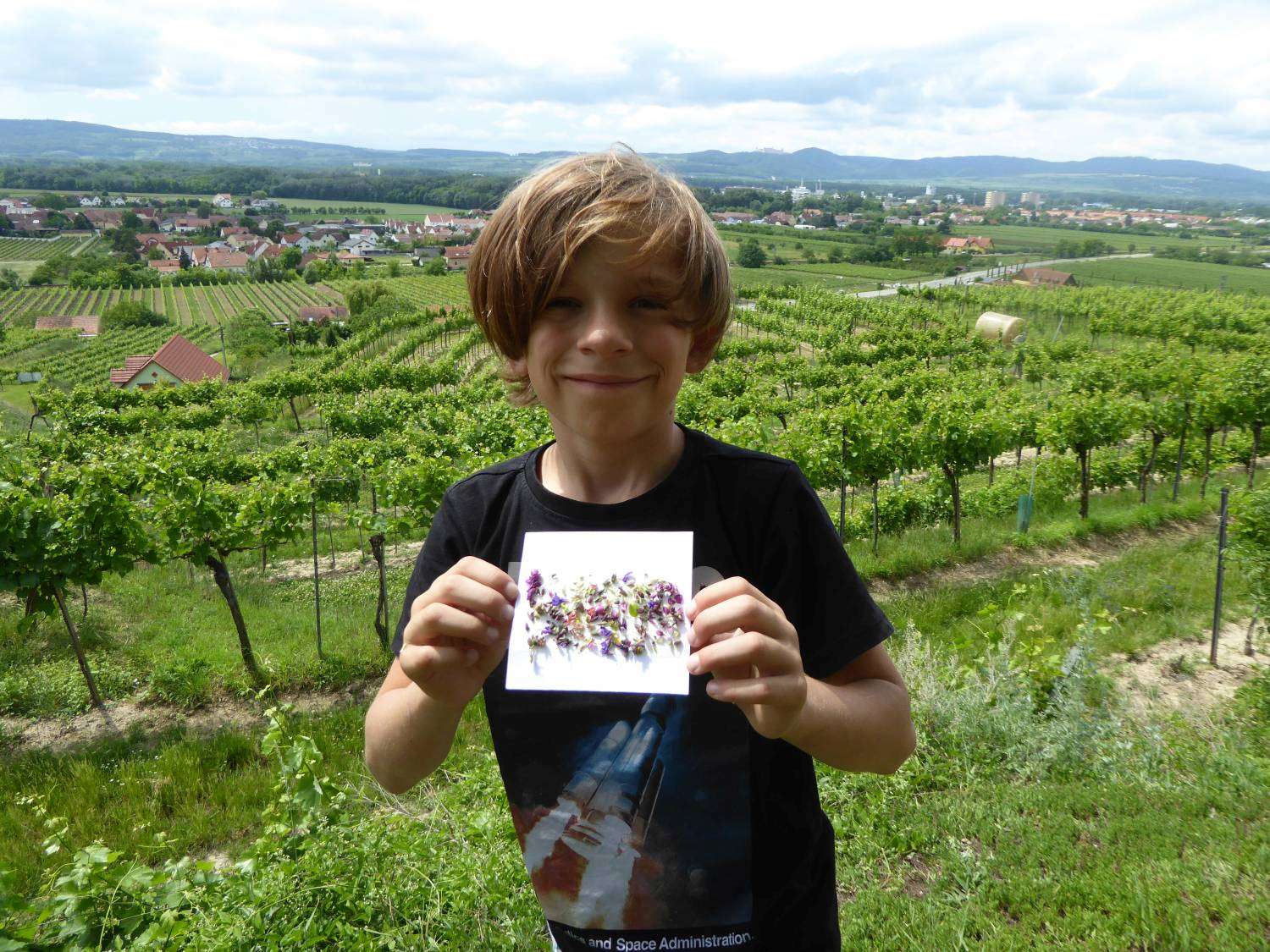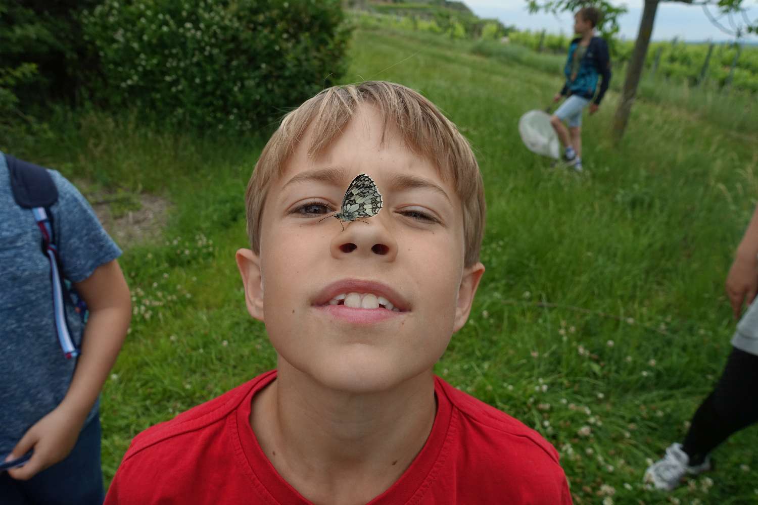 Hält das Wetter aus oder nicht? Wir, das heißt die 3. Klasse der Volksschule, sind optimistisch und machen uns auf den schnellsten Weg in die Weinberge, Umweltgemeinderat Franz Fehr begleitet uns auch ein Stück. Beim ersten Rastplatz fliegen uns trotz dichter Wolkendecke schon die ersten Schachbrett-Falter entgegen: frisch geschlüpft und prächtig anzusehen!