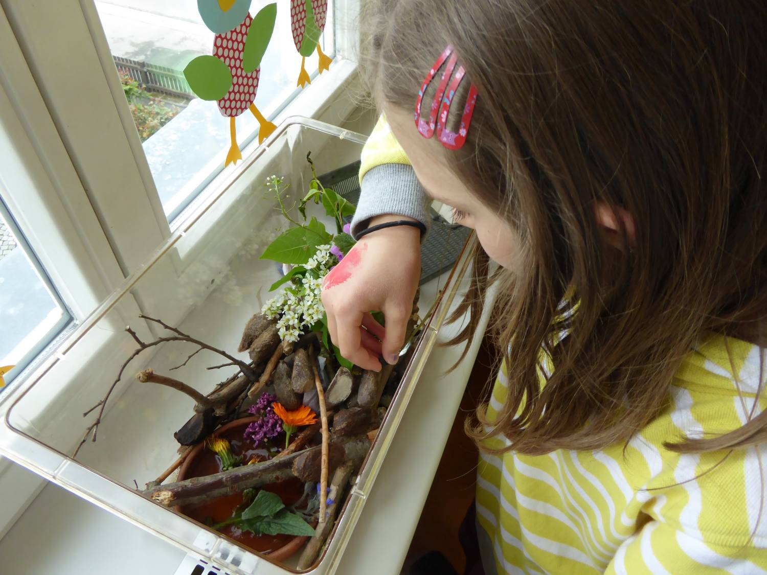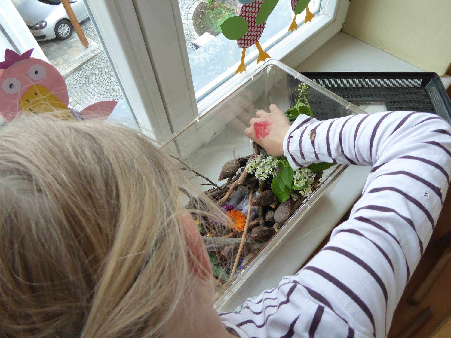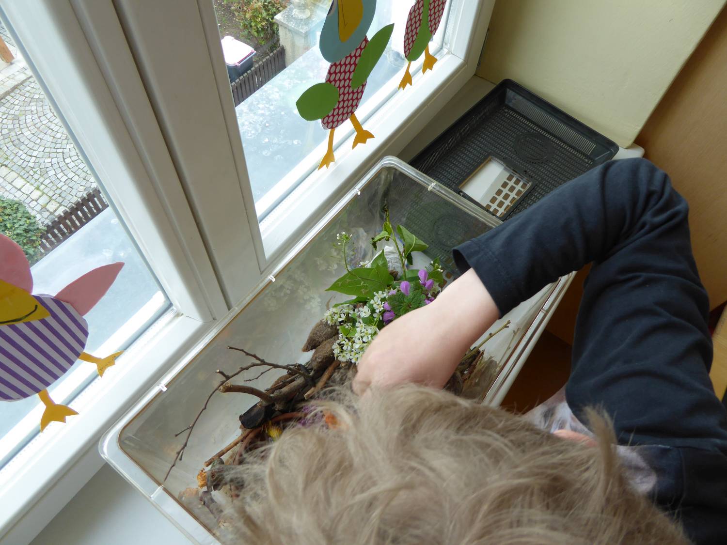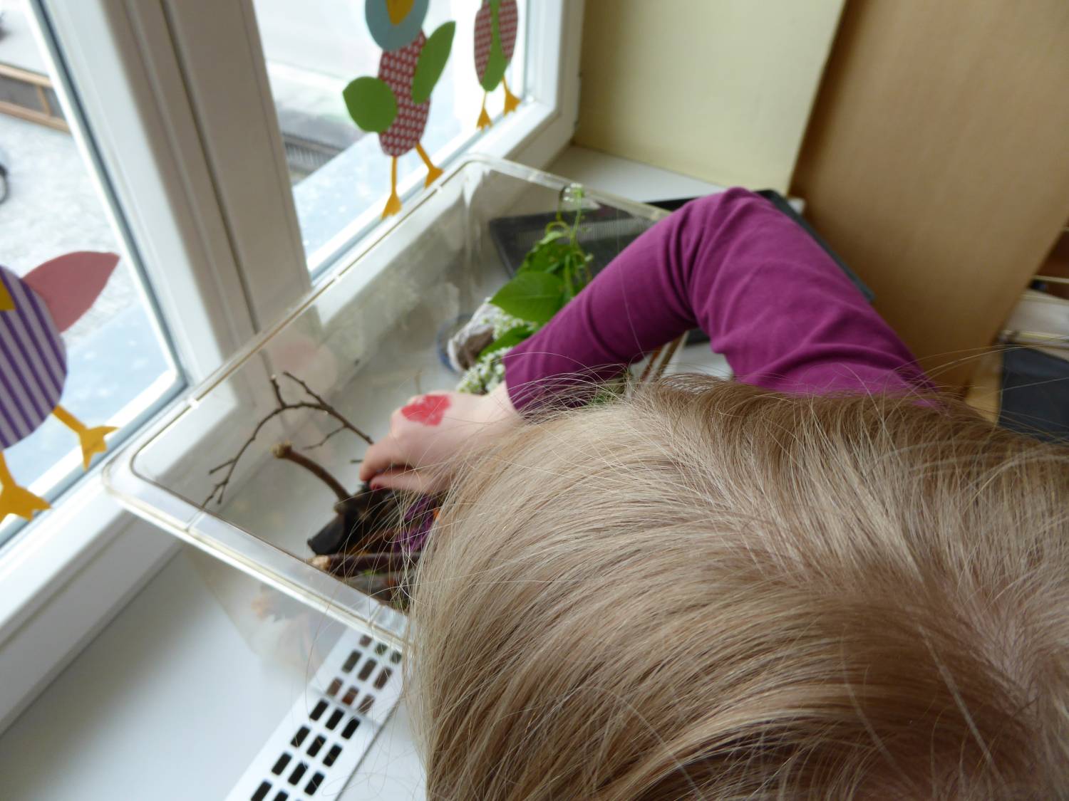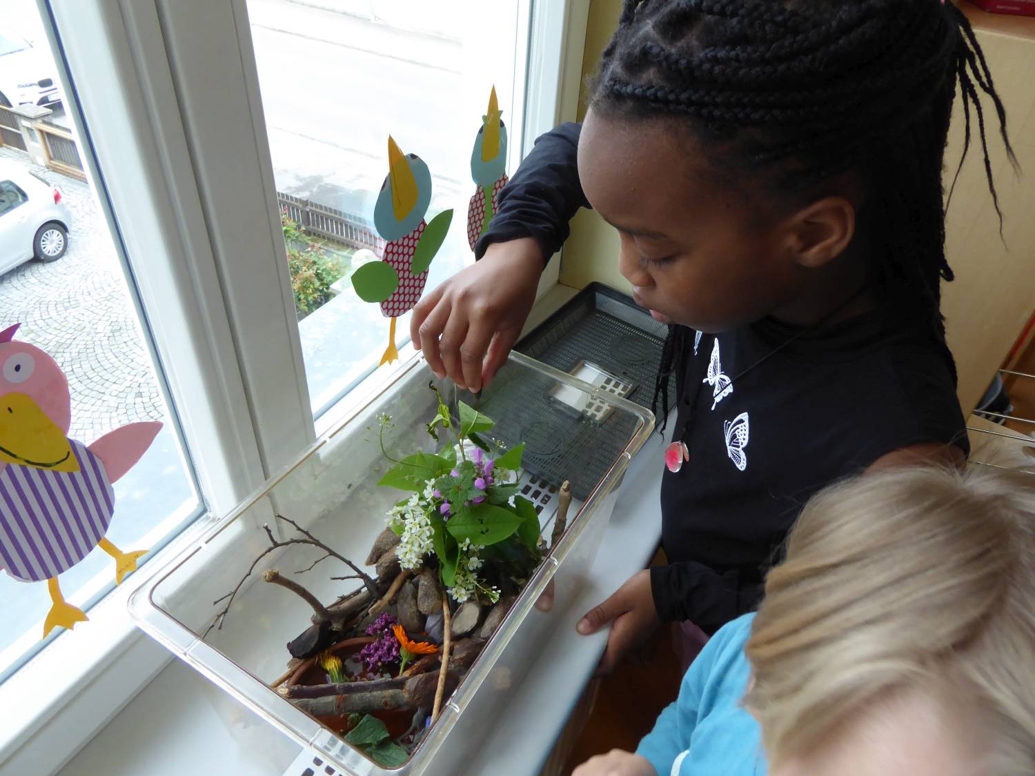 Der Falter braucht ein bisschen Zeit, um seine Flügel zu entfalten. Doch dann fischen die Kinder ihn versiert und dennoch vorsichtig und hochkonzentriert mit Holzsteckerln aus dem Puppenhaus und entlassen ihn in die Freiheit.