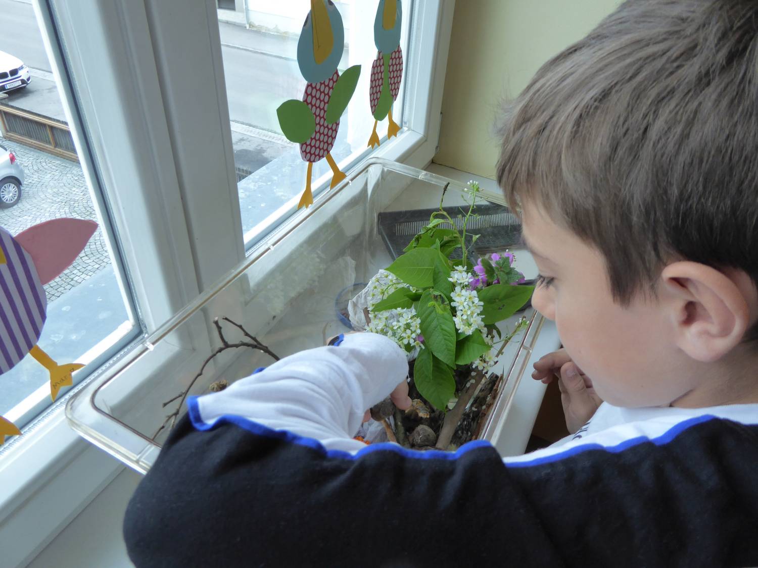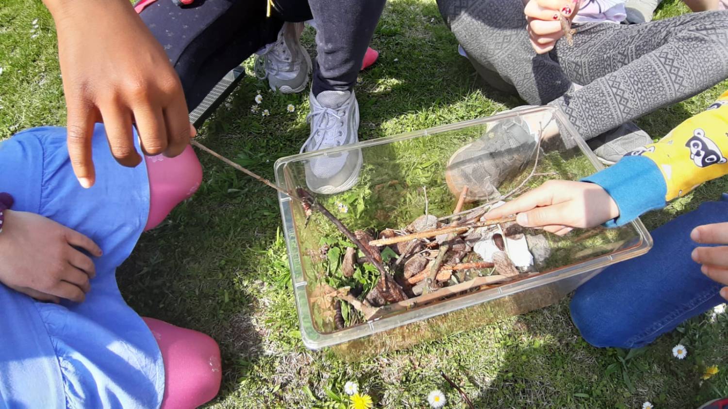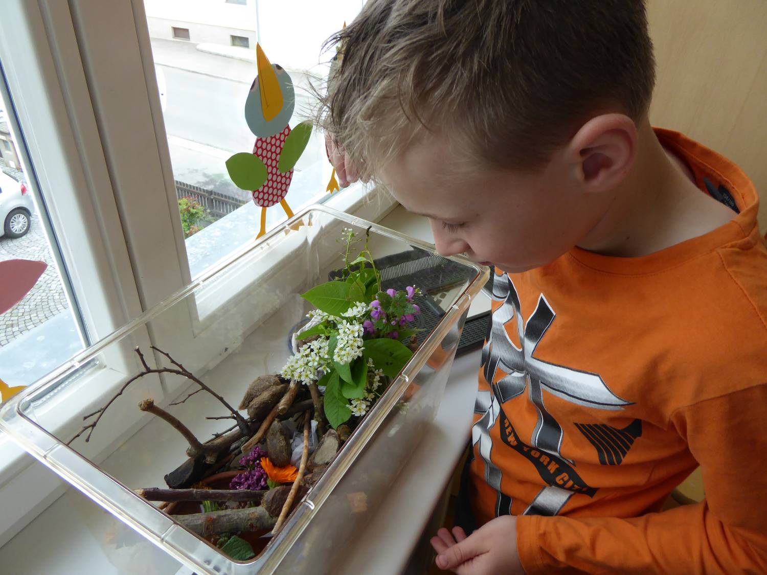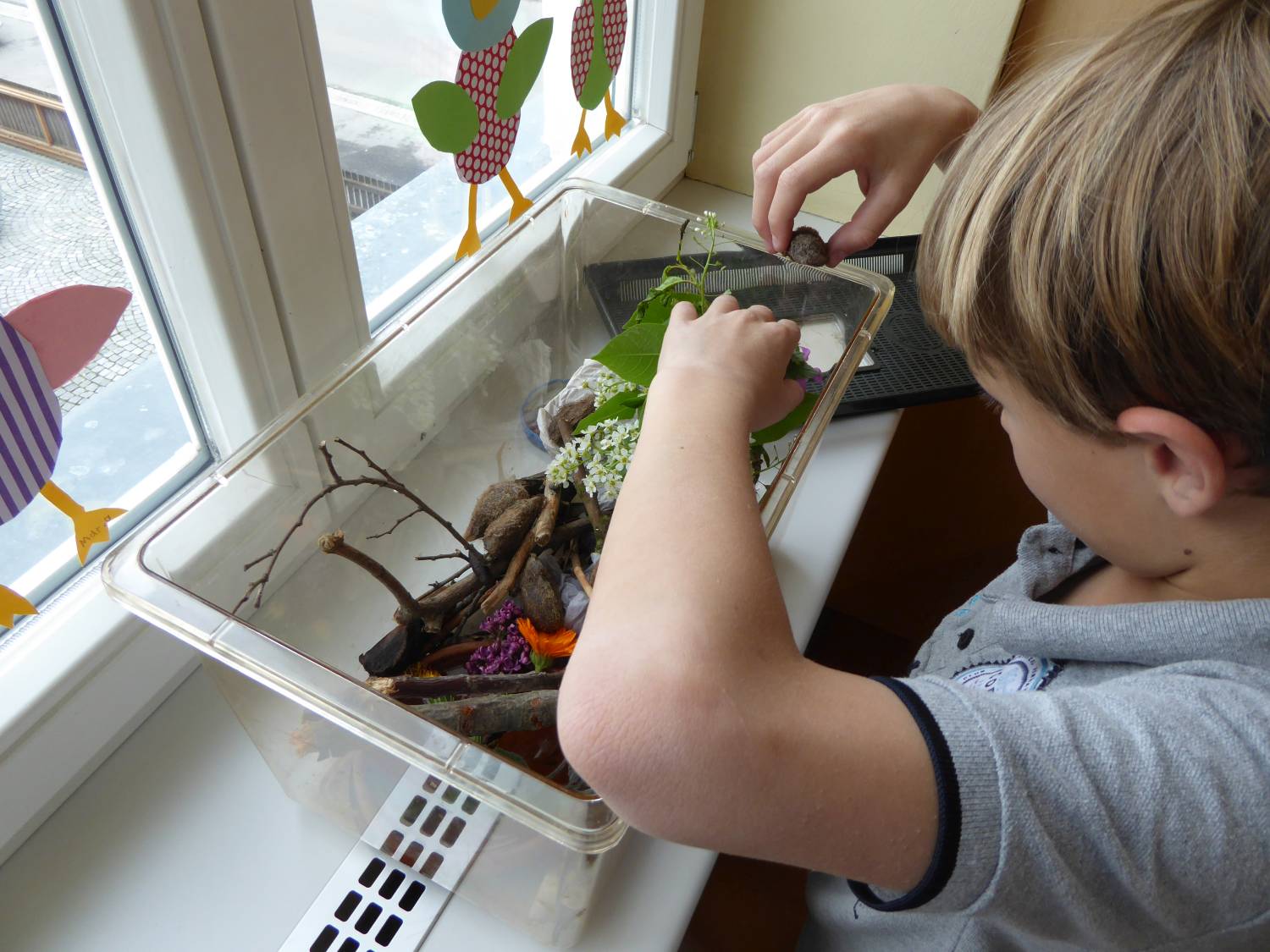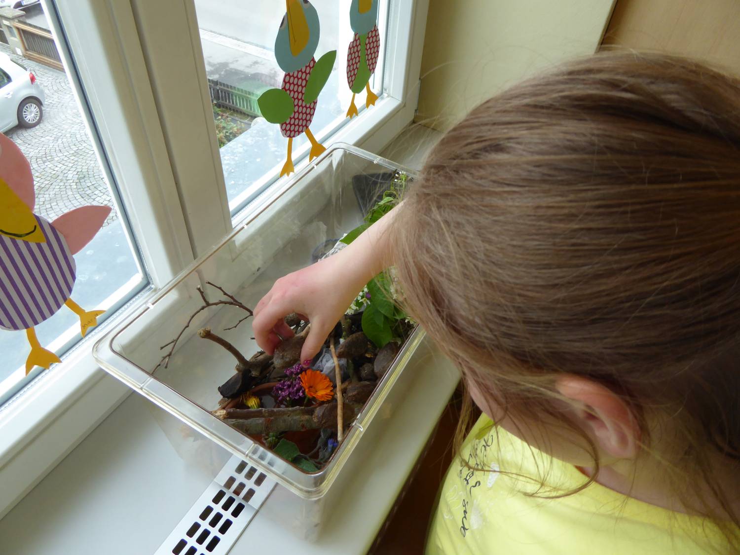 Der Falter braucht ein bisschen Zeit, um seine Flügel zu entfalten. Doch dann fischen die Kinder ihn versiert und dennoch vorsichtig und hochkonzentriert mit Holzsteckerln aus dem Puppenhaus und entlassen ihn in die Freiheit.
